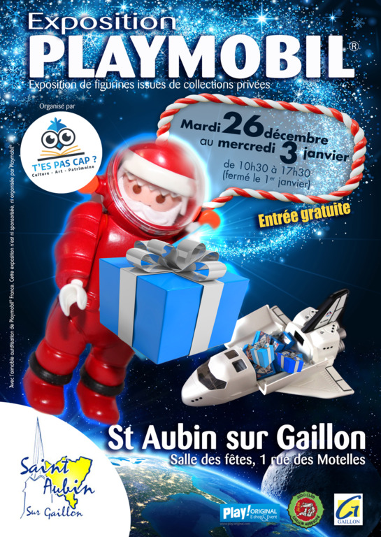 L'Association T'es pas Cap organise du mardi 26 décembre 2023 au mercredi 3 janvier 2024 une exposition Palymobil à la Salle des Fêtes de Saint-Aubin sur Gaillon.